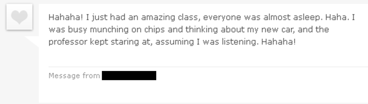 - What is this “amazing class”? His level of intelligence and maturity makes me think that this literally may be from a freshman in community college who was bored in his Intro to Sociology lecture. Aaaaand now I officially want to take a shower. Unfortunately I can’t verify his age or anything else about him because he has since deleted his profile, possibly because his mom found it on their family desktop and forced him to get rid of it when he was home for winter break.