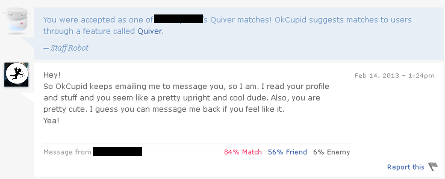 - “Okcupid keeps emailing me to message you”. I don’t know what site you’re on, sir, but the free internet dating service I signed up for has never aggressively and incessantly emailed me demanding that I message the same random person. If it did, no one would use it. As you can see from the screen cap, I showed up in this guy’s quiver, which is when okc gives you three profile suggestions for you to take a look at. When you delete those three people from your quiver, they give you three more. Okc will email them to you if you don’t turn off email alerts, like with anything else. You can easily ignore this altogether if you choose. So what happened was, I was one of this guy’s three suggested people. The end. Clearly he has a flair for the dramatics. Also, is this supposed to make me want to reply to your message? Essentially telling me that the adorable okc robot mascot (who PS I officially dubbed Sallybot… yes I’m still single) put a virtual gun to your head and that’s why you’re reaching out to me?