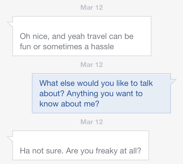 Excuse me? Topics we have covered so far: the weather, the T, the fact that you like pizza, and a trip you took to Puerto Rico. I don’t even know your name. You know nothing about me thus far, other than the fact that I would like to go to Puerto Rico because I have a friend that lives there. And the first thing you want to know about me is “Are you freaky at all?” Why are questions like this becoming socially acceptable?