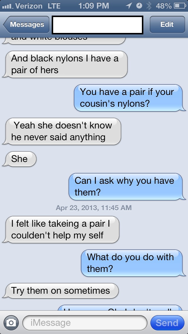 Call me crazy, but I’m less concerned about his desire to wear nylons than I am the whole cousin thing. I’m all about getting weird with a partner, but a family member’s undergarments? Not so much.