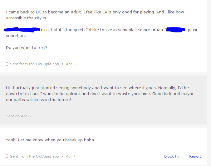 Of course, I’ve kept my OKC profile active, because 1) it’s early yet and 2) I’m a well-respected semi-famous dating blogger after all, and I need that profile for professional reasons. And, before I had decided I was actually dating the bachelor of the moment, I had been exchanging messages with a couple promising guys on OKC. Rather than just disappearing into thin air, as many many online daters before me have done, I decided to take the direct approach to let them know I wasn’t interested in going out: