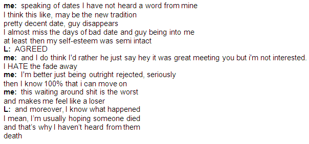 Me: Oh. Sorry you’re sick. We could have rescheduled…? GMU: I know, but I was looking forward to meeting you, and I also felt like since I kind of disappeared for a bit, it would have seemed extra shady for me to cancel at the last minute. I didn’t want you to think I was blowing you off. Despite that fact that we were still having this awkward ass conversation ON THE STAIRS as waiters and customers brushed by us, GMU earned some points for that. Because he’s right: the fact that he fully disappeared once, coupled with the fact that more often than not, the ‘I’m sick” excuse turns out to be bullshit, (and maybe the fact that Stupid Cupid is the patron blog of pessimistic over thinkers) means that I probably wouldn’t have believed him. Well played, GMU…