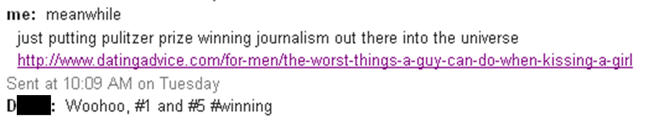In case you’re wondering, yes, we did call out an ex of mine in the article who I affectionately nicknamed Trouty Mouth, the same chump who canceled a date and dumped me the day after my birthday. So… am I thoroughly enjoying the fact that he’s been immortalized on the internet for being the worst kisser ever?