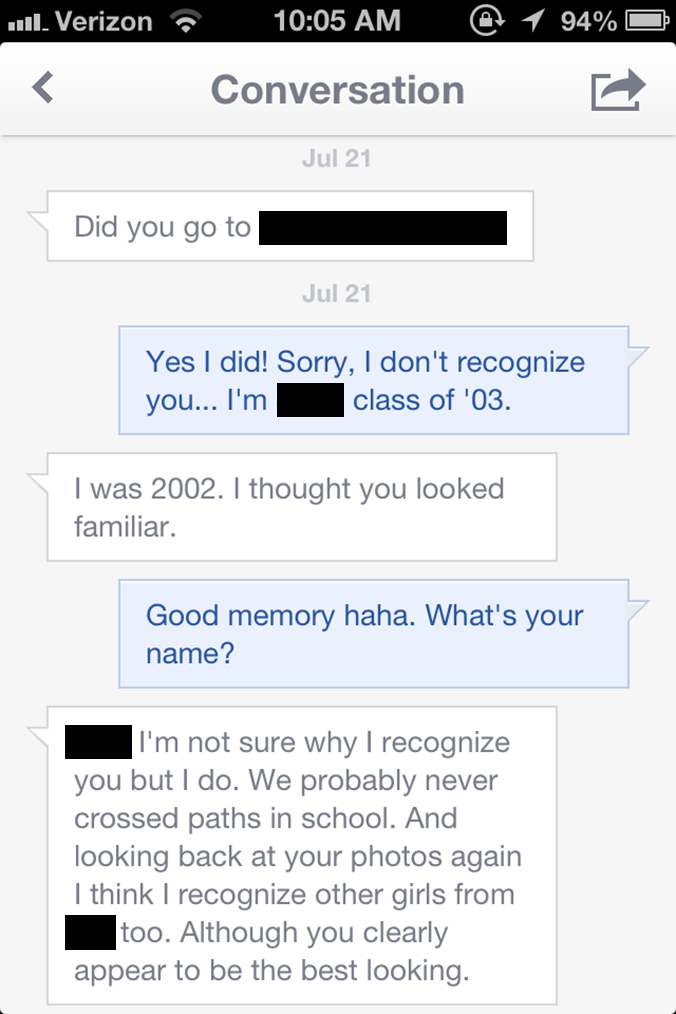1. ‘We probably never crossed paths in school’–Creepy, slash you’re obviously right since I have NO IDEA who you are.