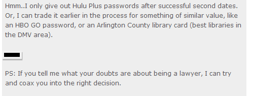 The week leading up to our date, we did a bit of light text flirting. Grouchketeer seemed to be enthusiastically pursuing me, which was great because I liked him, but at times I thought it might be a bit TOO enthusiastic. For instance, it had come up in conversation that I work for the same (large) company as his brother’s girlfriend, and one day he texted me asking if I could look her up in our employee directory. Assuming he wanted the info. for something legit, I did.